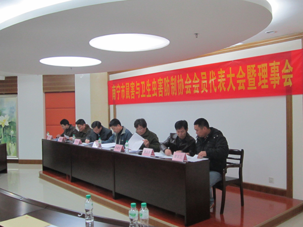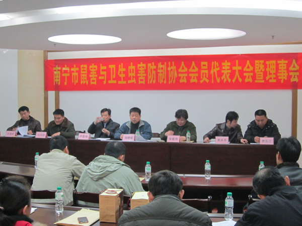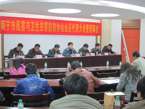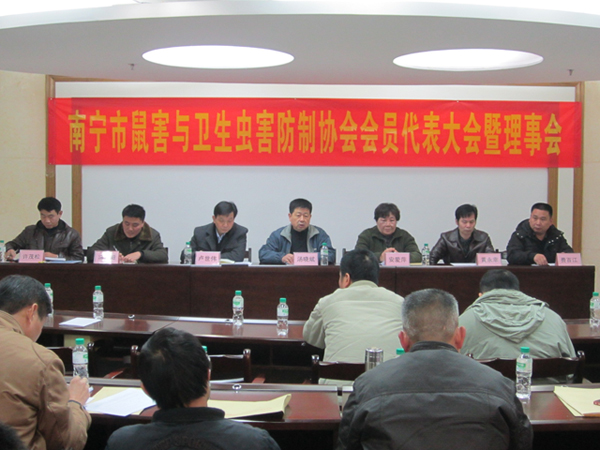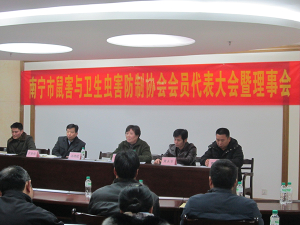 2012年元月9日,南寧市鼠害與衛(wèi)生蟲害防制協(xié)會(huì)在南寧市衛(wèi)生局召開了協(xié)會(huì)理事及全體會(huì)員大會(huì),會(huì)議審議并全體通過了協(xié)會(huì)工作報(bào)告、財(cái)務(wù)報(bào)告及新一屆協(xié)會(huì)領(lǐng)導(dǎo)選舉??祪艄究偨?jīng)理黃永幸先生當(dāng)選新一屆協(xié)會(huì)副會(huì)長。圖為南寧市衛(wèi)生局長湯曉斌、愛衛(wèi)辦常務(wù)副主任盧世偉、安愛萍會(huì)長(原南寧市疾控中心黨委書記)、愛衛(wèi)辦副主任許茂松(協(xié)會(huì)副會(huì)長)、副會(huì)長馮向陽(廣西自治區(qū)疾控病媒專家)、副會(huì)長黃永幸、秘書長費(fèi)百江在主席臺(tái)就座。